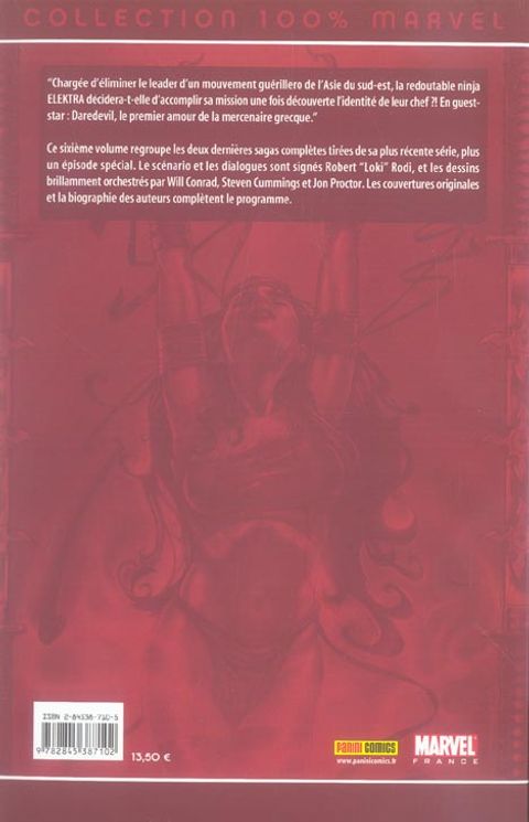 ""Chargée d'éliminer le leader d'un mouvement guérillero de l'Asie du sud-est, la redoutable ninja Elektra décidera-t-elle d'accomplir sa mission une fois découverte l'identité de leur chef ? ! En gueststar : Daredevil, le premier amour de la mercenaire grecque."" Ce sixième volume regroupe les deux dernières sagas complètes tirées de sa plus récente série, plus un épisode spécial. Le scénario et les dialogues sont signés Robert ""Loki"" Rodi, et les dessins brillamment orchestrés par Will Conrad, Steven Cummings et Jon Proctor. Les couvertures originales et la biographie des auteurs complètent le programme.