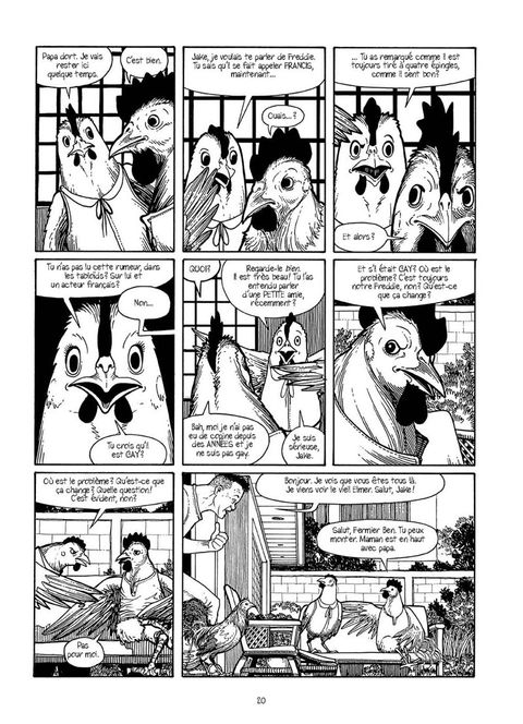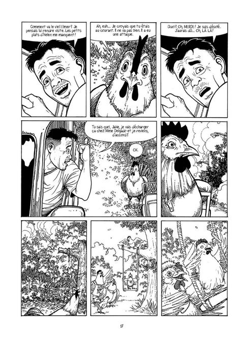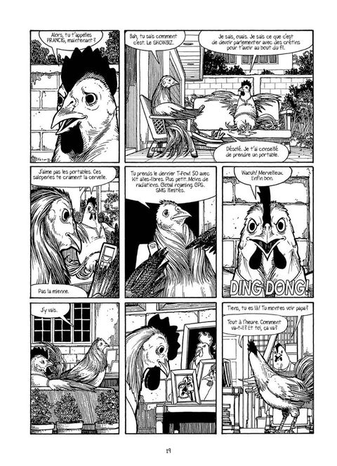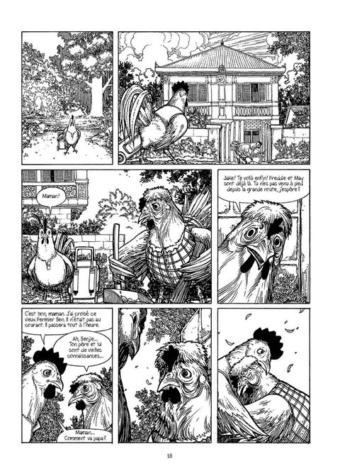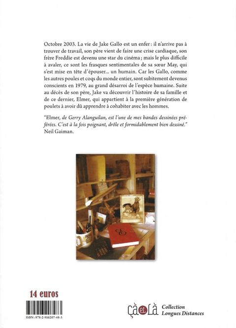 Octobre 2003. La vie de Jake Gallo est un enfer, il est sans travail, son père a fait une crise cardiaque, son frère Freddie est une star du cinéma, mais le plus difficile à avaler, ce sont les frasques sentimentales de sa soeur May qui s'est mis en tête d'épouser... un humain. Car les Gallo, comme les autres poules et coqs du monde entier, sont subitement devenus conscients en 1979 au grand désarroi de l'espèce humaine. Suite au décès de son père, Jake va découvrir l'histoire de sa famille et de son père, Elmer, qui fait partie de la génération des coqs qui ont dû apprendre à cohabiter avec les hommes. Elmer est l'histoire d'une famille de gallinacées qui lutte pour sa survie dans un environnement hostile. À la fois drôle et émouvant, Gerry Alanguilan, maîtrise de bout en bout avec une candeur enthousiasmante cette parabole maquillée en chronique délirante.