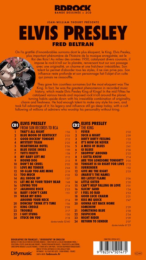 Livre disque de collection contenant 2 Cds du meilleur des titres d'Elvis Presley et un album BD d'une trentaine de pages par Fred Beltran. CD1 1. That’s All Right Mama 2. Blue Moon of Kentucky 3. Good Rockin’ Tonight 4. Mystery Train 5. Heartbreak Hotel 6. Blue Suede Shoes 7. Tutti Frutti 8. My Baby Left Me 9. Hound Dog 10. Don’t Be Cruel 11. Love Me Tender 12. So Glad You Are Mine 13. Too Much 14. All Shook up 15. Let Me Be Your Teddy Bear 16. Loving You 17. Jailhouse Rock 18. Baby I Don’t Care 19. Wear My Ring Around Your Neck 20. Doncha’ Think It’s Time 21. King Creole 22. Trouble 23. I Got Stung 24. Stuck on You CD2 1. Fever 2. Such a Night 3. Dirty Dirty Feeling 4. It’s Now or Never 5. A Mess of Blues 6. GI Blues 7. Shoppin’ Around 8. I Gotta Know 9. Are You Lonesome Tonight? 10. Tonight Is so Right for Love 11. Surrender 12. Give Me the Right 13. (Marie’s the Name) His Latest Flame 14. Little Sister 15. Can’t Help Falling in Love 16. Slicin’ Sand 17. I Feel so Bad 18. Good Luck Charm 19. Kiss Me Quick 20. Gonna Get Back Home Somehow 21. Something Blue 22. Suspicion 23. Night Rider 24. Return to Sender