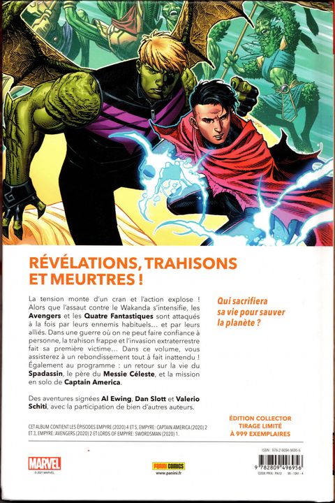 Révélations, trahisons et meurtres ! La tension monte d'un cran et l'action explose ! Alors que l'assaut contre le Wakanda s'intensifie, les Avengers et les Quatre Fantastiques sont attaqués à la fois par leur ennemis habituels... et par leurs alliés. Dans une guerre où on ne peut faire confiance à personne, la trahison frappe et l'invasion extraterrestre fait sa première victime... Dans ce volume, vous assisterez à un rebondissement tout à fait inattendu ! Egalement au programme : un retour sur la vie du Spadassin, le père du Messie Céleste, et la mission en solo de Captain America. Contient les épisodes US : • Empyre (2020) #4-5, • Empyre: Captain America (2020) #2-3, • Empyre: Avengers (2020) #2, • Lords of Empyre: Swordsman (2020) #1.