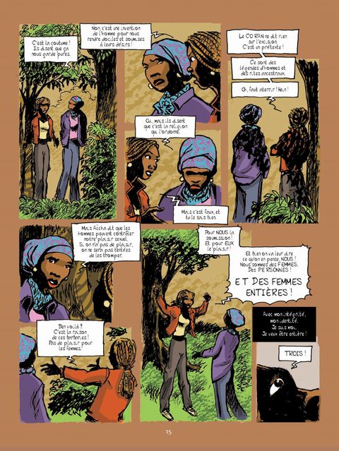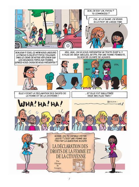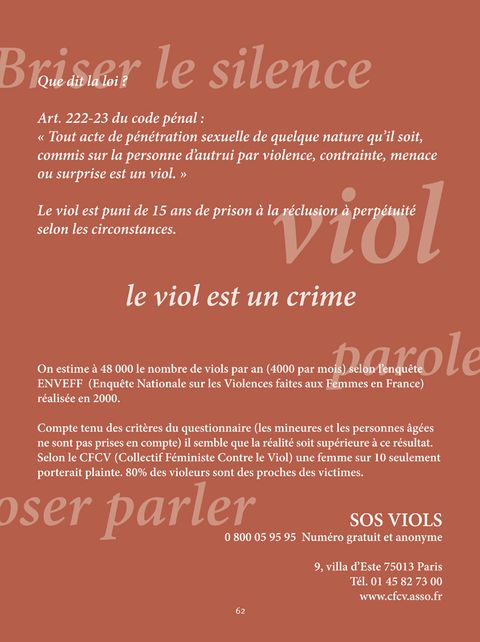 La violence faite aux femmes dénoncée avec : - Des illustrations - 1 texte illustré de Denis Lapière et Daphné Collignon ==> Viol comme arme de guerre - 1 texte illustré de Lio et Bernard Swysen ==> Témoignage perso - 7 bandes dessinées : 1/ Chloé et Fatou (Moinard-Swysen) - Fil rouge (8 pages environ réparties sur tout le livre) 2/ Awa - L'excison(Moinard/Masson) (5 ou 6 planches) 3/ Le mariage forcé - Titre à venir (Jeanne Puchol) (4 planches) 4/ Celles des autres - le viol - (Kris/Nicoby) (8 planches) 5/ La traite en vue de la prostitution -Titre à venir (Moinard/Samama) (4 à 5 planches) 6/ La violence conjugale avec viol - titre à venir (Corbeyran/Vanders) ( 20 planches n&b apparemment ) 7/ Les femmes dans le monde - titre à venir (4 pages entre texte illustré et bande dessinée de Chantal de Spiegeeler.)