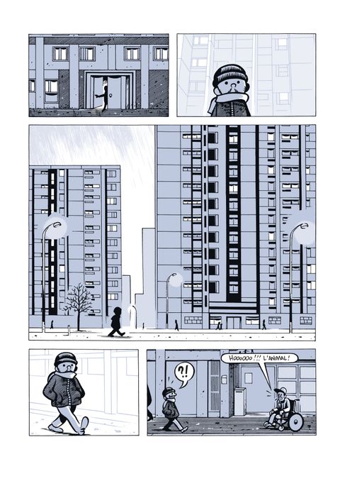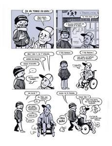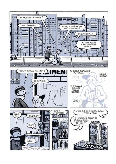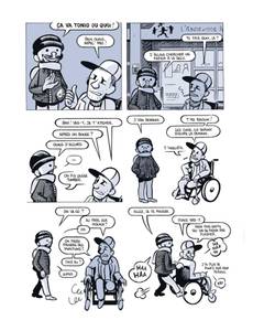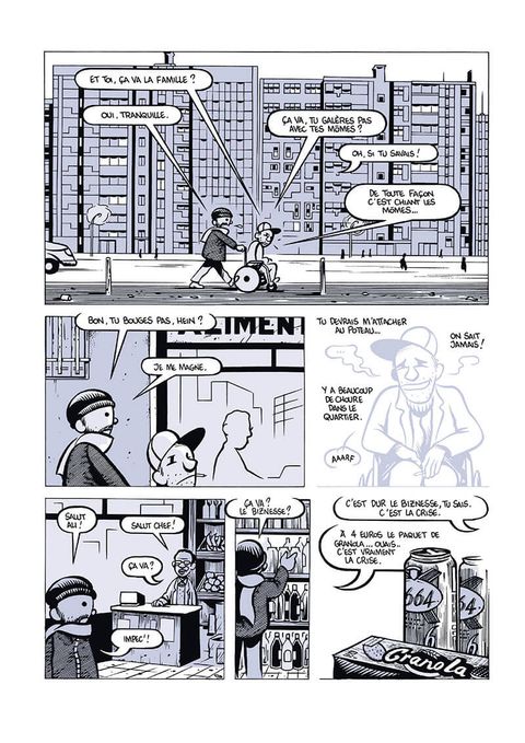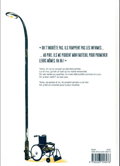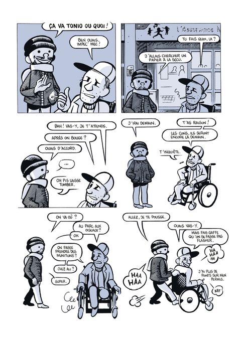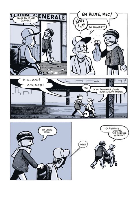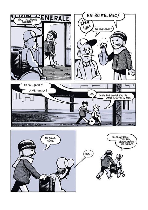 «Oh t'inquiète pas. Ils frappent pas les infirmes... Au pire, ils me piquent mon fauteuil pour promener leurs mômes. Ha ha ! Tonio, on va lui couper sa dernière jambe. Lui et moi, ça fait un bail qu'on traîne ensemble. On est restés au quartier, on s'est débrouillés comme on a pu. On a bien vieilli? Je sais pas.