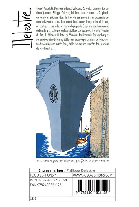 Philou, pour les intimes, a le sens et le goût du ridicule. C'est l'essence (sûrement) et le moteur (probablement) de son humour, très british pour un Lorrain, 100 % mirabelle. Delestre mijote la cocasserie, croque le pittoresque, mitonne le saugrenu, déguste l'absurde. Son côté espiègle n'a pas échappé à Pierre Perret qui préface « Delestre se met à table » : « Ce mec n'est pas sérieux et heureusement pour nous. Ses digressions philosophiques de bon aloi ont parfois des fragrances allaisiennes ». Le regretté Cabu avait eu ce mot gentil : « Avec Philippe Delestre, on comprend tout, on rit souvent, on ne le trouve jamais méchant⦠et l'on apprécie toujours sa finesse d'esprit ». Cette fois, Delestre trouve l'inspiration iodée du bord de mer, avec un spi dans le ciboulot. Il jette les filets dans ses souvenirs de vacances familiales dans le Morbihan. On lève l'encre marine. Laissez-vous embarquer !