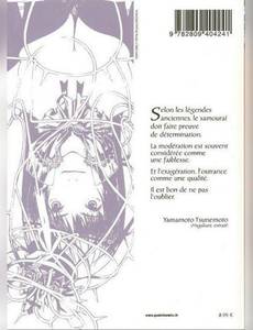 Selon les légendes anciennes, le samouraï doit faire preuve de détermination. La modération est souvent considérée comme une faiblesse. et l'exagération, l'outrance comme une qualité. il est bon de ne pas l'oublier. yamamoto tsunemoto.