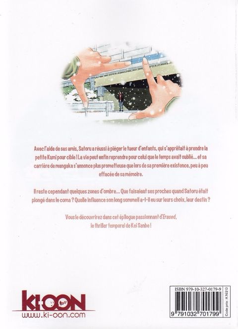 Un recueil constitué de plusieurs histoires annexes à l'intrigue principale ! Avec l'aide de ses amis, Satoru a réussi à piéger le tueur d'enfants, qui s'apprêtait à prendre la petite Kumi pour cible ! La vie peut enfin reprendre pour celui que le temps avait oublié... et sa carrière de mangaka s'annonce plus prometteuse que lors de sa première existence, peu à peu effacée de sa mémoire. Il reste cependant quelques zones d'ombre... Que faisaient ses proches quand Satoru était plongé dans le coma ? Quelle influence son long sommeil a-t-il eu sur leurs choix, leur destin ? Vous le découvrirez dans cet épilogue passionnant d'Erased, le thriller temporel de Kei Sanbe !