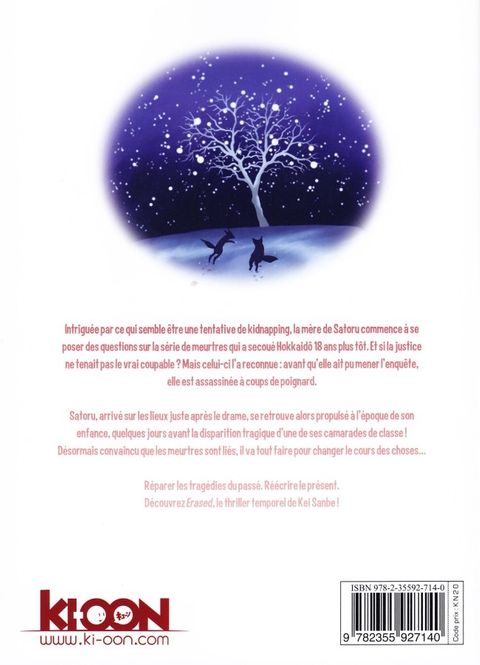 2006. Aspirant mangaka dont la carrière peine à décoller, Satoru Fujinuma travaille comme livreur de pizzas pour joindre les deux bouts. Effacé et peu enclin à s'ouvrir aux autres, il observe le monde qui l'entoure sans vraiment y prendre part. Pourtant, Satoru possède un don exceptionnel : à chaque fois qu'un incident ou une tragédie se déroule près de lui, il est projeté quelques minutes dans le passé pour empêcher l'inévitable avant qu'il ne se produise... Cette anomalie de l'espace-temps lui vaut un séjour à l'hôpital le jour où, pour rattraper le conducteur d'un camion fou, il est percuté par un autre véhicule de plein fouet. Après l'accident, petit à petit, les souvenirs effacés de l'enfance traumatisante de Satoru resurgissent... Réparer les tragédies du passé pour accepter le présent... Découvrez Erased, le thriller temporel de Kei Sanbe !