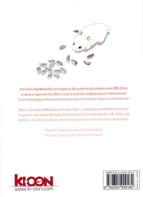 Satoru décide de cacher Kayo pour la mettre à l'abri et alerter les autorités sur la maltraitance dont elle est victime. Avec l'aide de son ami Kenya, il installe la fillette dans un bus désaffecté. Mais voilà qu'un inquiétant visiteur fait son apparition, les forçant à déménager ! Grâce à leurs efforts, ainsi qu'à l'intervention de M. Yashiro et de la mère de Satoru, Kayo est confiée à la garde de sa grand-mère. À présent que sa camarade est sauvée, le jeune garçon relâche un peu sa vigilance, cependant le tueur en série court toujours. Réparer les tragédies du passé. Réécrire le présent. Découvrez Erased, le thriller temporel de Kei Sanbe !