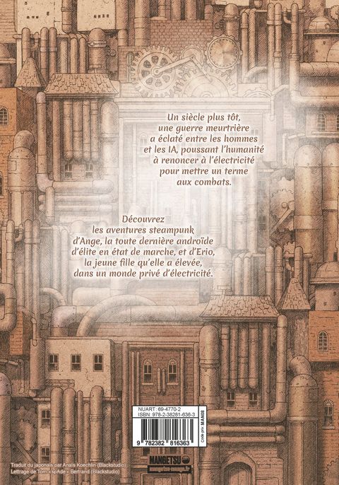 Un siècle plus tôt, une guerre meurtrière a éclaté entre les hommes et les IA, poussant l'humanité à renoncer à l'électricité pour mettre un terme aux combats. Découvrez les aventures steampunk d'Ange, la toute dernière droïde d'élite en état de marche, et d'Erio, la jeune fille qu'elle a élevée, dans un monde désormais privé d'électricité.Publié dans le Young Jump Comics, Erio & The Electric Doll est le nouveau bijou des éditions Shueisha scénarisé par Shimazaki Mujirushi et dessiné par Kuroimori (Steam Reverie in Amber).