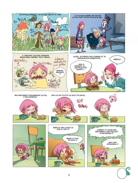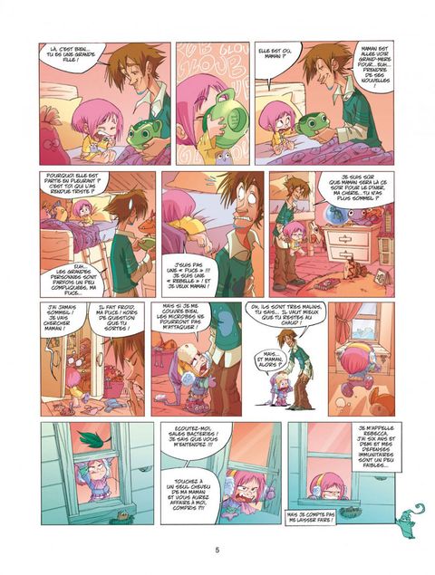 Elle s'appelle Rebecca, elle a six ans, bientôt et demi. Ses défenses immunitaires sont un peu faibles, mais elle ne compte pas se laisser faire: elle va prouver au monde qu'elle n'est pas une puce. Partie chasser la grenouille par temps de pluie, Rebecca attrape finalement Ernest, un drôle de microbe qui n'a pas la langue dans sa poche. Le genre d'ami bien utile à l'heure où les parents se perdent dans leurs disputes de grands. Un nouvel album-jeunesse des plus originaux qui marie un graphisme très moderne avec une grande sensibilité dans le scénario.