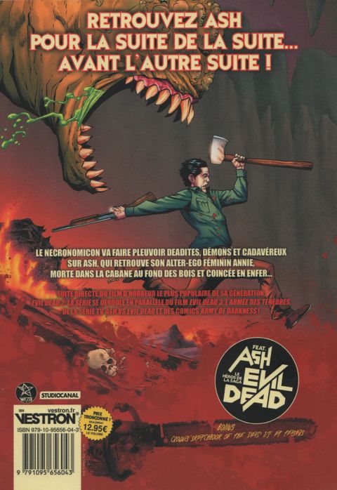 La suite de la suite avant l'autre suite ! Certifié D'ENFER et 100% officiel. Evil Dead 2, La série démarre là où Sam Raimi et Bruce Campbell ont bouclé le film : Annie, morte dans la cabane dans les bois, se retrouve coincée en enfer avec Ash. Ensemble, ils devront affronter les démons pour tenter de sauver ses parents. Réussiront-ils ? Se feront-ils tous dévorer l'âme avant l'aube ? Le Necronomicon va faire pleuvoir les cadavéreux sur Ash dans cette nouvelle série (et ses albums dérivés !) se déroulant en parallèle de Ash vs Evil Dead et Army of Darkness.
