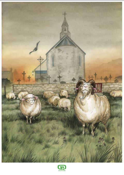 Le pre derriere l'eglise print A3 les moutons by christian paty exclusif pulp's bd