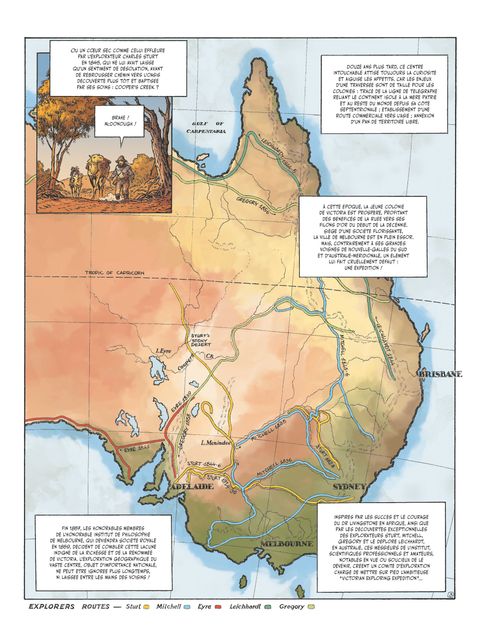 La première traversée de l'Australie !En 1860, la Royal Society of Victoria mandate l'explorateur Robert O'Hara Burke, assisté du géomètre William John Wills, pour mener une expédition de 18 hommes et tenter la traversée du sud au nord de l'Australie, de Melbourne au golfe de Carpenterie. 2 800 kilomètres à travers l'inconnu, l'intérieur de l'Australie n'ayant encore jamais été exploré par les colons européens. Mais dès le départ, l'expédition de Burke et Wills est minée par des conflits internes, de mauvais calculs et de grossières erreurs de jugements. Malgré cela, la détermination des hommes les mènera jusqu'à l'autre bout du continent... Mais à quel prix ?La collection « Explora » raconte l'expédition de Burke et Wills, première traversée méridionale de l'Australie qui se finira en tragédie. Entre tensions internes, rencontres avec les Aborigènes, désert aride et marécage hostile, revivez une traversée aussi difficile que fascinante, une aventure humaine à la découverte d'un nouveau monde.