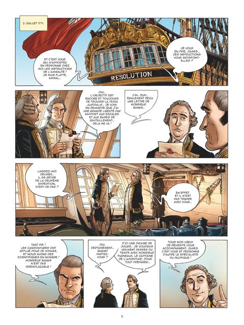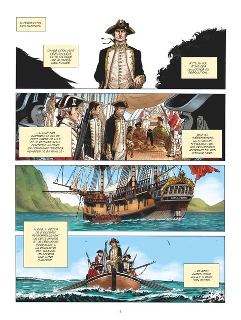 Explorerpour éclairer l'humanité.Doté d'un grand sens marin et très doué pour la cartographie, James Cook est sans conteste l'un des plus grands navigateurs de l'histoire de l'exploration maritime. Ce capitaine anglais de la Royal Navy a consacré l'essentiel de sa carrière à naviguer autour du globe, et notamment dans l'océan Pacifique où ses voyages ont donné lieu à de nombreuses découvertes et cartes qui ont changé notre vision du monde. James Cook débute sa carrière dans la marine royale britannique en 1755, avant de devenir un cartographe hors-pair durant une campagne dans l'actuel Canada. Son premier voyage autour du monde, à bord de l'Endeavour, est d'une portée considérable pour l'histoire de la géographie océanienne et va asseoir sa stature. Deux autres voyages suivent, au cours desquels, entre autres, il effectue le tour complet de la Nouvelle-Zélande, explore la Nouvelle-Calédonie, s'approche du continent Antarctique, étudie l'île de Pâques, apporte la preuve que le grand continent austral supposé n'existe pas et découvre Hawaï (Iles Sandwich à l'époque) où il trouve la mort en 1779 dans des circonstances particulièrement tragiques.Après avoir écrit les formidables romans graphiquesTerra AustralisetTerra Doloris, consacrés à la naissance de l'Australie moderne, LF Bollée retourne dans l'hémisphère sud et les terres australes pour rendre un hommage passionné à l'un des plus grands explorateurs de tous les temps à travers un diptyque de la collection Explora dessiné avec brio par Federico Nardo qui peut à nouveau exprimer pleinement son goût pour l'aventure et les grands espaces.