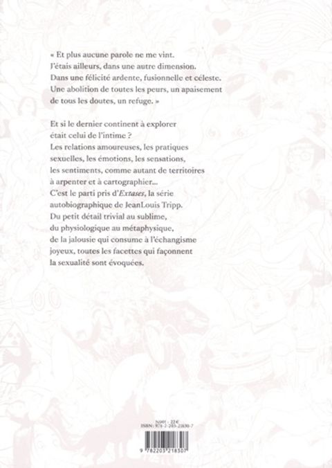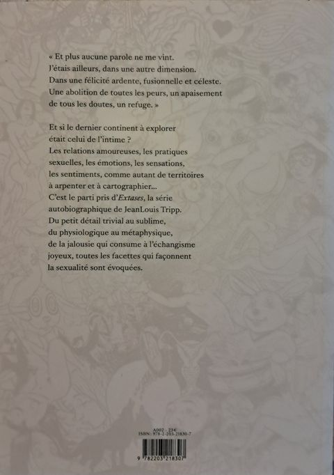 Après Magasin Général, Jean-Louis Tripp nous livre un témoignage sincère et intime de sa vie sexuelle. Et si le dernier continent à explorer était celui de l'intime ? Les relations amoureuses, les pratiques sexuelles, les émotions, les sensations, les sentiments, comme autant de territoires à arpenter à cartographier... C'est le parti pris d'Extases, la série autobiographique de JeanLouis Tripp. Du petit détail trivial au sublime, du physiologique au métaphysique, de la jalousie qui consume à l'échangisme joyeux, toutes les facettes qui façonnent la sexualité sont évoquées.