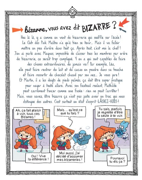Dans ce nouveau tome de la collection des Extra Mortelle Adèle, la petite rouquine fait encore des siennes. Cette fois-ci, pas question de mettre la maîtresse devant ses contradictions ou d'envoyer Geoffroy à l'hôpital... Adèle a décidé que les paillettes, ça suffit ! Elle rassemble autour d'elle la petite troupe des enfants de sa classe qui ne ressemblent pas aux autres. Ensemble, ils vont prouver que face au groupe des Pink Malibus de Jade et Miranda, le club des Bizarres peut résister ! Une belle manière de retrouver l'univers de Mortelle Adèle tout en se fatiguant les méninges... et les zygomatiques ! Des gags courts pour une lecture plaisir. Autour de la question du droit à la différence, une nouvelle compilation de jeux en tous genres : BD - Bricolages - Activités - Papertoys