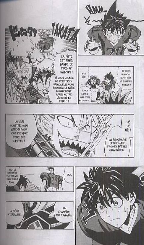 Le dénouement de l’affrontement entre les Devil Bats et les Nagas. Sena réussira t’il à passer Agon ? On voit ensuite rapidement les 3 autres quarts de finale, et Shin met au point une nouvelle technique Anti-Eyeshield. —————— Toujours une masterclass au dessin et dans le rythme !! Vite la suite !!!