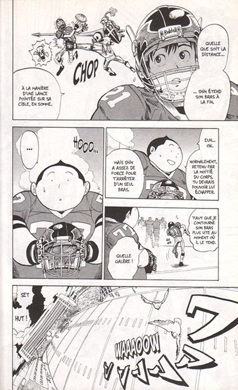 Difficile de se faire respecter quand on est depuis toujours le souffre-douleur de ses camarades ! Sena le sait bien, lui qui est constamment chargé de faire le « coursier » pour tous ceux qui le briment. Pour cette rentrée scolaire, Sena veut tourner la page et se décide à rentrer dans un club. Malheureusement pour lui, il croise le chemin de Hiruma, le responsable du club de football américain, un être psychotique prêt à toutes les combines pour faire rentrer des joueurs dans son club. Lorsqu'il découvre que Sena est doté d'un jeu de jambe hors du commun, il décide de jeter son dévolu sur le pauvre garçon. Et ils n'ont pas intérêt à tarder de recruter les onze autres joueurs manquants pour former une équipe, car le début du championnat inter lycéen débute... dans 24 heures ! Eye Shield 21 est la nouvelle bombe sportive du Shônen Jump, un mélange détonnant d'humour et d'action qui fait actuellement fureur au Japon ! Vous ne connaissez rien au foot américain ? Rassurez-vous, le héros non plus ! Preuve est faite, encore une fois, que les japonais sont capables de rendre passionnant n'importe quel sujet. Un futur hit du shônen en France !