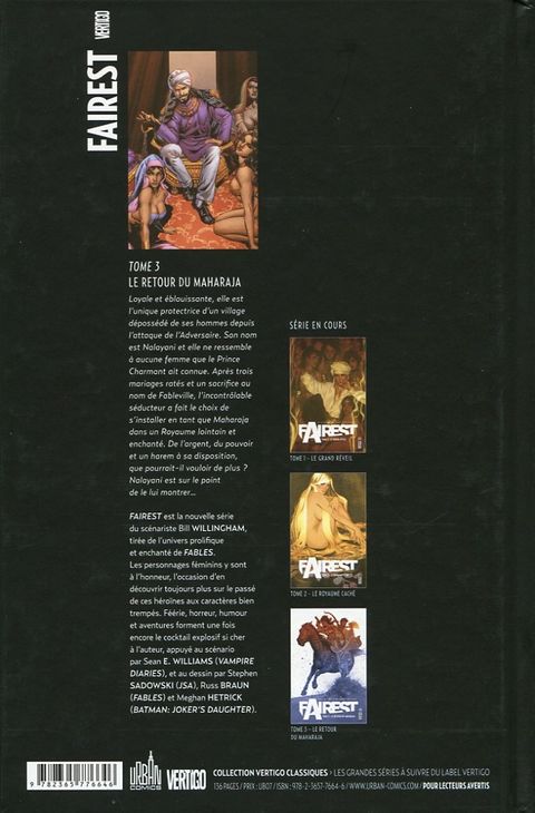 Loyale et éblouissante, elle est l'unique protectrice d'un village dépossédé de ses hommes depuis l'attaque de l'Adversaire. Son nom est Nalayani et elle ne ressemble à aucune femme que le Prince Charmant ait connue. Après trois mariages ratés et un sacrifice au nom de Fableville, l'incontrôlable séducteur a fait le choix de s'installer en tant que Maharaja dans un Royaume lointain et enchanté. De l'argent, du pouvoir et un harem à sa disposition, que pourrait-il vouloir de plus ? Nalayani est sur le point de le lui montrer.