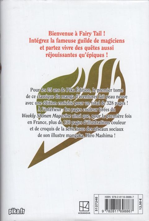 Pour les 25 ans de Pika Édition, le premier tome de ce classique du manga d’aventures fait peau neuve avec une édition enrichie pour un total de 328 pages ! À l'intérieur : les pages couleur tirées du Weekly Shônen Magazine ainsi que, pour la première fois en France, plus de 130 pages d'illustrations couleur et de croquis de la série issus des réseaux sociaux de son illustre mangaka, Hiro Mashima !
