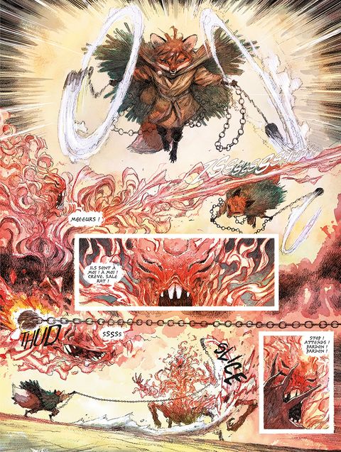 Dans un monde où cohabitent humains et animaux doués de parole, Fang la renarde a fait de la chasse aux démons sa spécialité. Sous le dessin de Niko Henrichon magnifié par une mise en couleur directe à l'aquarelle, la chasseuse traque les esprits malfaisants au coeur d'un univers fantastique teinté de folklore chinois. Duels à mort, Seigneur des ténèbres, impertinence et poésie sont au menu de cette nouvelle série aux allures de conte initiatique, peuplée de personnages hauts en couleur.