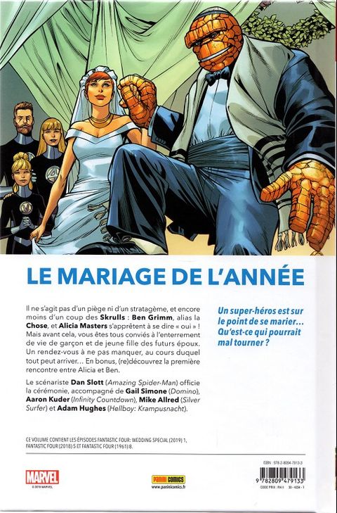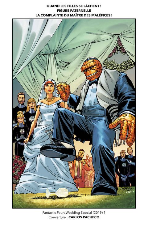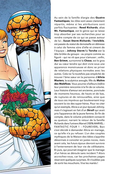 L'épisode 650 des Fantastic Four (le cinquième de cette nouvelle série) nous invite au mariage de la Chose. On retrouve ensuite les héros face à leurs deux plus grands ennemis dans des épisodes rythmés et plein d'action. Le mariage du siècle ! Ben Grimm épouse Alicia Masters. On doute que la cérémonie unissant un super-héros à la fille d'un super-vilain se déroule dans l'allégresse et la bonne humeur. À moins que... En plus, Galactus envahit la Latvérie, la patrie du Docteur Fatalis !