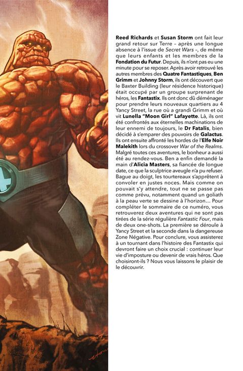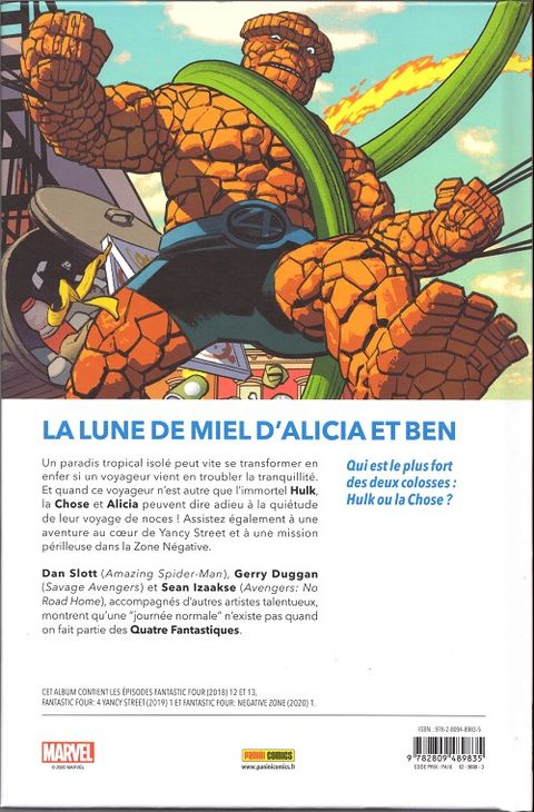 La Chose contre l'immortel Hulk : est-ce que Ben Grimm a la moindre chance ? Surtout lorsqu'il n'a que quelques minutes pour mettre fin au combat ? En plus de ce face-à-face historique, retrouvez deux long one-shots sur Yancy Street et la Zone Négative. Ce quatrième tome de la série Fantastic Four (lancée avec un tome 1 à 10 ? en 2019) peut tout à fait se savourer comme un one-shot avec trois récits complets signés par Dan Slott (Superior Spider-Man), Gerry Duggan (Savage Avengers), Mike Carey (X-Men) et les dessinateurs Sean Izaakse (Uncanny Avengers), Stefano Caselli (Avengers) et Greg Smallwood (Moon Knight).