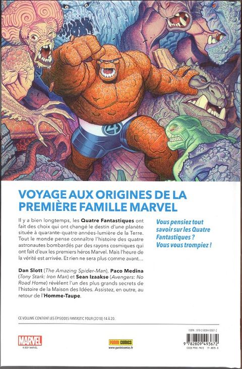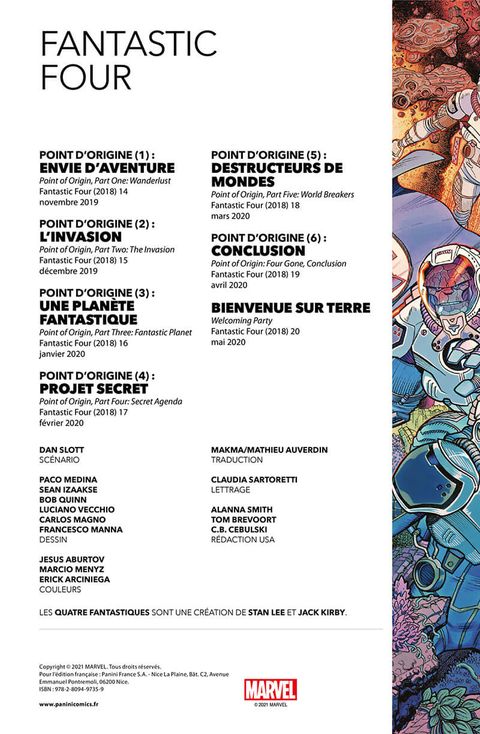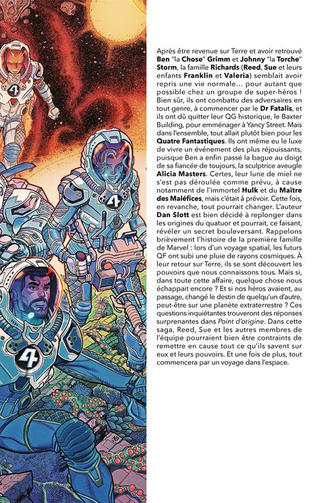 Quel est le pire regret de Reed Richards ? Vous allez le découvrir dans Point d'origine, une saga complète qui emmène les Quatre Fantastiques au seul endroit où ils ne sont jamais allés ! Une aventure qui va les confronter à un terrible secret concernant leurs origines et qui pourrait bien transformer l'équipe à jamais. Comment le premier voyage des Fantastiques a-t-il changé le destin d'une planète, à des années-lumière de là ? Nul ne sortira indemne de cette aventure. Quand Dan Slott s'attelle à une série, c'est pour exploiter toute la riche histoire des personnages qu'il prend en charge, comme on l'a vu notamment tout au long de ses mémorables années passées sur la série Amazing Spider-Man. Il fait de même ici avec un album qui sert par ailleurs de prologue à Empyre, le crossover Marvel de l'année qui frappera en mars !