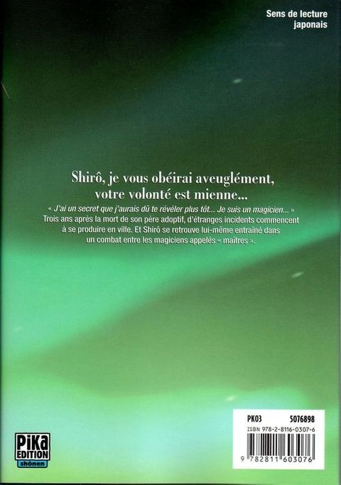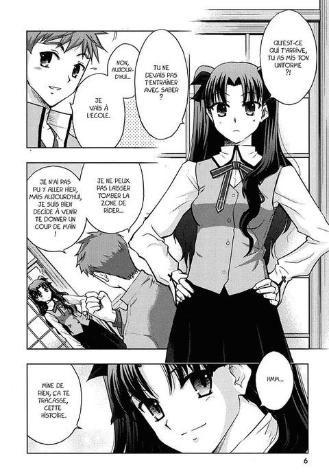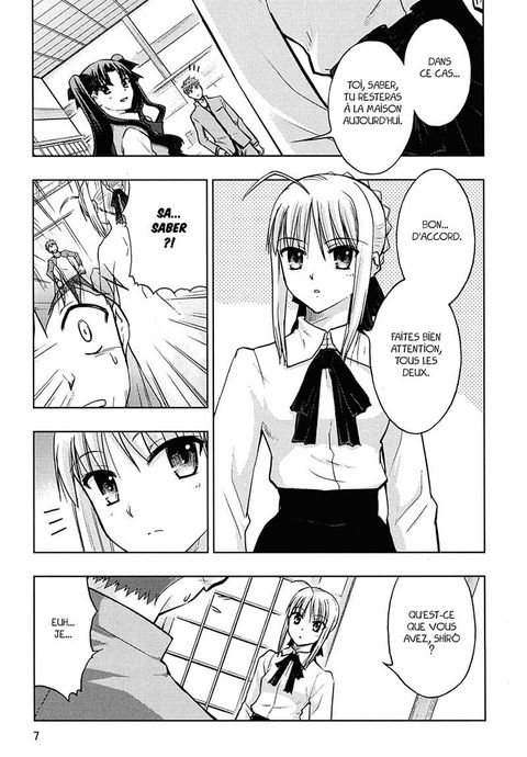 Encore enfant, Shirô Emiya survit miraculeusement à un incendie. Désormais seul au monde, il est recueilli par un homme d'une grande bonté. Shirô se promet, pour suivre les traces de son père adoptif, de venir lui aussi en aide aux autres. Un voeu auquel il essaie constamment d'être fidèle durant son adolescence. Au lycée, il rend service à quiconque réclame ses services. Shirô mène alors une existence normale, mais son destin bascule soudainement, lorsqu'il surprend deux individus qui se battent en duel. Le combat ne semble pouvoir se terminer que par la mort d'un des deux participants. Repéré, le jeune homme s'enfuit la peur au ventre, mais est bientôt rattrapé... C'est alors qu'un pouvoir magique semble jaillir de l'adolescent et le protège. Malheureusement, cela ne suffit pas face aux assauts furieux de son adversaire qui s'apprête à lui porter un coup fatal... Une guerrière blonde au regard dur apparaît alors comme par magie, repousse l'attaquant et se tourne vers Shirô. De ses lèvres s'échappe une question, étonnante et directe : « Êtes-vous mon maître ? ».