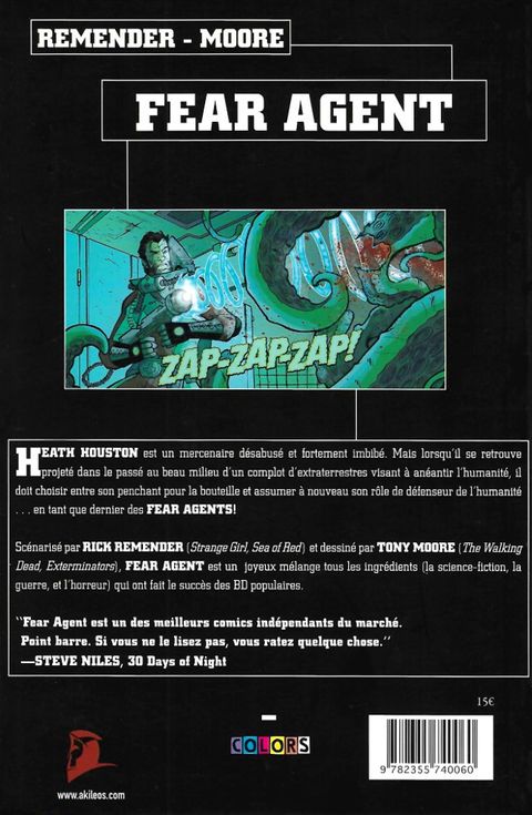 Heath houston est un mercenaire désabusé et fortement imbibé. Mais lorsqu'il se retrouve projeté dans le passé au beau milieu d'un complot d'extraterrestres visant à anéantir l'humanité, il doit choisir entre son penchant pour la bouteille et assumer à nouveau son râle de défenseur de l'humanité . . en tant que dernier des fear agents! scénarisé par rick remender (strange girl, sea of red) et dessiné par tony moore (the walking dead, exterrninators), fear agent est un joyeux mélange tous les ingrédients (la science-fiction, la guerre, et l'horreur) qui ont fait le succès des bd populaires.