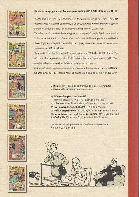 Ce volume est le premier d'une intégrale de 11 albums, qui comprendra toutes les 67 aventures de ce célèbre héros de l'œuvre de Maurice Tillieux, publiées dans leur ordre chronologique, ainsi que les très recherchés Programmes non-stop et les annonces publiées dans les Héroïc-Albums et dans d'autres publications de l'époque. Un abondant dossier illustré de documents rares sur Maurice Tillieux explique la genèse des aventures de Félix et présente toutes les parutions de cette série dans les différents magazines édités en Belgique et en France. Contient les aventures suivantes et leurs Programmes non-stop : - N'y Touchez pas, il est maudit #25 - L'Homme invisible #26 - Le Tumulus #27 - Félix n'est pas rentré #28 - Cent dollars le rêve #29 - On Liquide ! #30