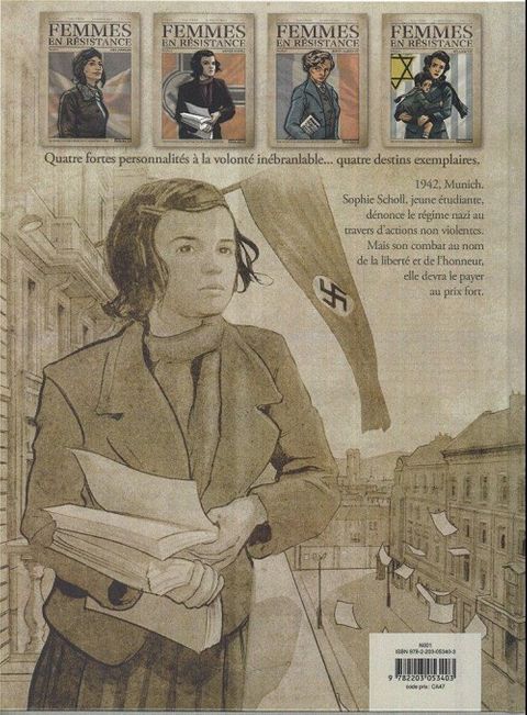Cette tétralogie dont chacun des albums est mis en images par un dessinateur différent s’attache aux destins et parcours croisés de cinq femmes d’exception au cours de la Seconde Guerre mondiale. Quatre d’entre elles, toutes mortes très jeunes (Amy Johnson, Sophie Scholl, Bertie Albrecht et Mila Racine), ont réellement existé. Seule la cinquième, Anna Schaerer, est un personnage fictif ; elle permet de faire le lien entre ces différentes héroïnes, qui au cours du conflit n’ont pas toutes été dans le même camp. Après l’évocation de l’aviatrice britannique Amy Johnson par Pierre Wachs, voici le deuxième volet de cet ambitieux projet : l’histoire tragique de Sophie Scholl, une très jeune allemande qui osa résister de l’intérieur au régime nazi avec son mouvement la Rose Blanche – au prix de sa vie.