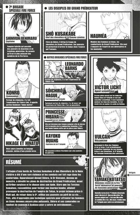 L'humanité est terrifiée par le phénomène de combustion humaine. Des brigades spéciales Fire Force ont donc été mises en place avec pour mission de trouver la cause de ce mystérieux phénomène ! Le jeune Shinra, nouvelle recrue surnommée le Démon, rêve de devenir un héros. Mais le chemin sera long et il devra, avec ses camarades, apprendre à affronter quotidiennement des Torches humaines !!