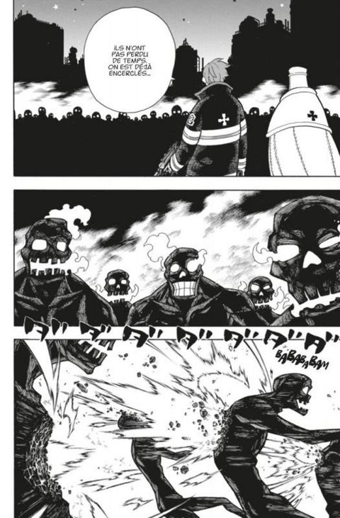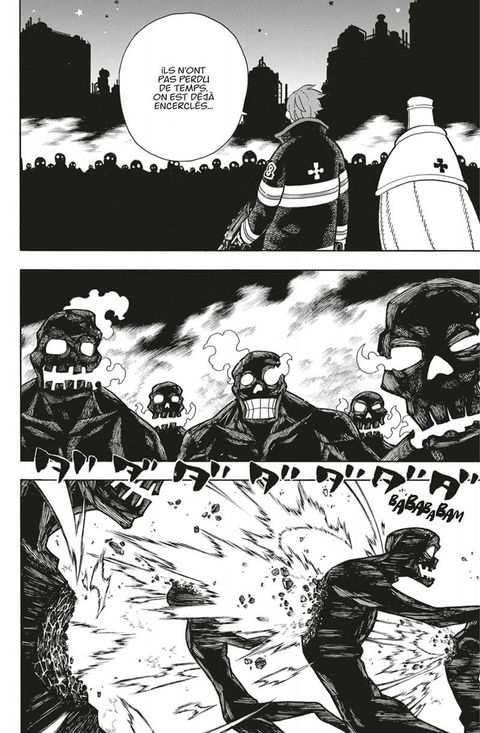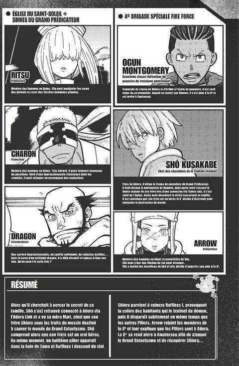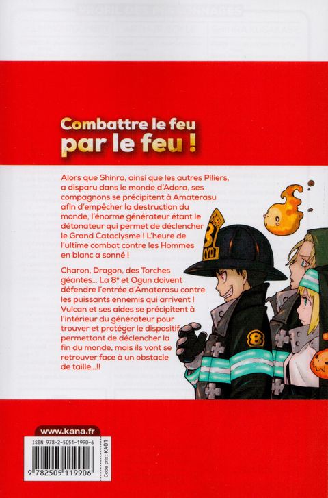 Alors que Shinra, ainsi que les autres Piliers, a disparu dans le monde d'Adora, ses compagnons se précipitent à Amaterasu afin d'empêcher la destruction du monde, l'énorme générateur étant le détonateur qui permet de déclencher le Grand Cataclysme ! L'heure de l'ultime combat contre les Hommes en blanc a sonné ! Charon, Dragon, des Torches géantes... La 8e et Ogun doivent défendre l'entrée d'Amaterasu contre les puissants ennemis qui arrivent ! Vulcan et ses aides se précipitent à l'intérieur du générateur pour trouver et protéger le dispositif permettant de déclencher la fin du monde, mais ils vont se retrouver face à un obstacle de taille...!! Les combats font rage à l'intérieur et à l'extérieur d'Amaterasu ! Les pompiers doivent protéger le monde contre la menace du Grand Cataclysme !! Que la Fire Force soit avec eux !!