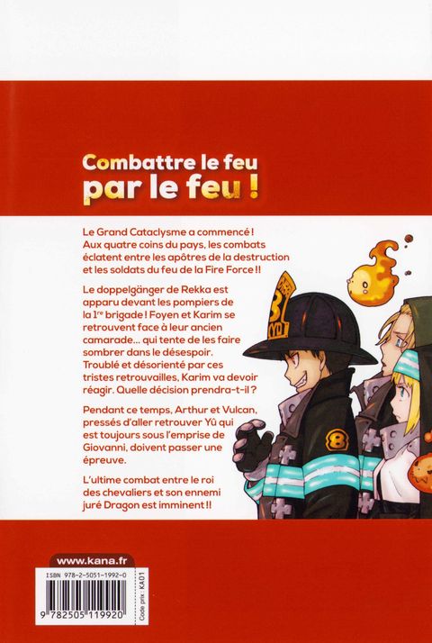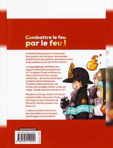 Le Grand Cataclysme a commencé ! Aux quatre coins du pays, les combats éclatent entre les apôtres de la destruction et les soldats du feu de la Fire Force !! Le doppelgänger de Rekka est apparu devant les pompiers de la 1re brigade ! Foyen et Karim se retrouvent face à leur ancien camarade... qui tente de les faire sombrer dans le désespoir. Troublé et désorienté par ces tristes retrouvailles, Karim va devoir réagir. Quelle décision prendra-t-il ? Pendant ce temps, Arthur et Vulcan, pressés d'aller retrouver Yû qui est toujours sous l'emprise de Giovanni, doivent passer une épreuve. L'ultime combat entre le roi des chevaliers et son ennemi juré Dragon est imminent !!