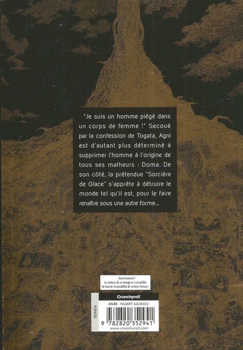 "Je suis un homme piègé dans un corps de femme !" Secoué par la confession de Togata, Agni est d'autant plus déterminé à supprimer l'homme à l'origine de tous ses malheurs : Doma. De son côté, la prétendue "Sorcière de Glace" s'apprête à détruire le monde tel qu'il est, pour le faire renaître sous une autre forme...