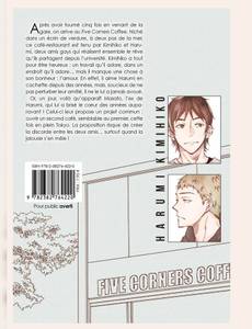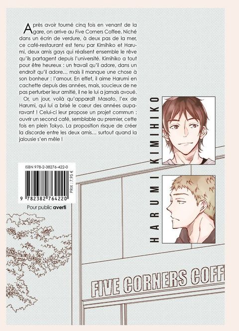 Après avoir tourné cinq fois en venant de la gare, on arrive au Five Corners Coffee. Niché dans un écrin de verdure, à deux pas de la mer, ce café-restaurant est tenu par Kimihiko et Harumi, deux amis gays qui réalisent ensemble le rêve qu'ils partagent depuis l'université. Kimihiko a tout pour être heureux : un travail qu'il adore, dans un endroit qu'il adore... mais il manque une chose à son bonheur : l'amour. En effet, il aime Harumi en cachette depuis des années, mais, soucieux de ne pas perturber leur amitié, il ne le lui a jamais avoué. Or, un jour, voilà qu'apparaît Masato, l'ex de Harumi, qui lui a brisé le coeur des années auparavant ! Celui-ci leur propose un projet commun : ouvrir un second café, semblable au premier, cette fois en plein Tokyo. La proposition risque de créer la discorde entre les deux amis... surtout quand la jalousie s'en mêle !"
