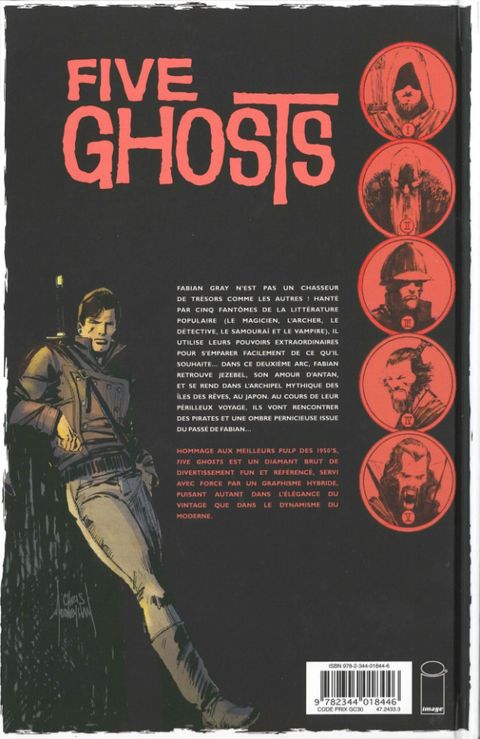 Pour posséder, être possédé est un plus. Fabian Gray n'est pas un chasseur de trésors comme les autres ! Hanté par 5 fantômes de la littérature populaire (le Magicien, l'Archer, le Détective, le Samouraï et le Vampire), il utilise leurs pouvoirs extraordinaires pour s'emparer facilement de ce qu'il souhaite. Dans ce deuxième arc, Fabian retrouve Jezebel, son amour d'antan, et se rend dans l'archipel mythique des Îles des Rêves au Japon. Dans leur périlleux voyage, ils vont rencontrer des pirates et une ombre pernicieuse issue du passé de Fabian... Hommage aux meilleurs pulp des 1950's, Five Ghost est un diamant brut de divertissement fun et référencé, servi avec force par un graphisme hybride, puisant autant dans l'élégance du vintage que dans le dynamisme du moderne.