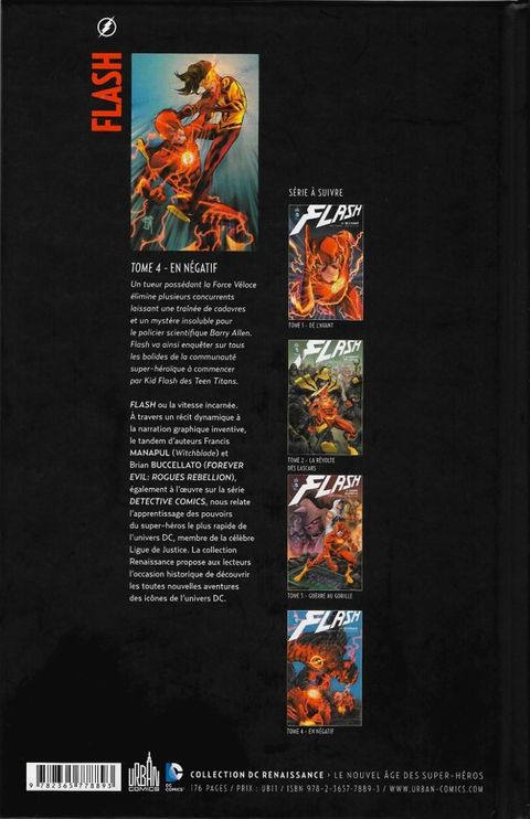 Un tueur possédant la Force Véloce élimine plusieurs concurrents laissant une traînée de cadavres et un mystère insoluble pour le policier scientifique Barry Allen. Flash va ainsi enquêter sur tous les bolides de la communauté super-héroïque à commencer par Kid Flash des Teen Titans. Contenu : Flash Vol.4: Reverse (Flash #20-25 + 23.1: Reverse Flash)