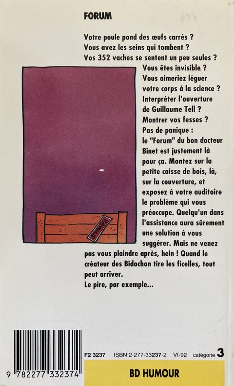 Cet album est une véritable poilade des phrases absurdes qu'on a tous pensées un jour : mais si quelqu'un n'est pas d'accord qu'il le dise ! Paru à l'époque dans le mensuel Fluide Glacial, ces gags en 3 cases étaient signés Binet. Voici ses recommandations de lecture - car, entre nous, faire un résumé de forum c'est pas chose aisée : Chaque strip est divisé en trois parties égales. A, B, et C La première partie est réservée à l'exposition du sujet. Un personnage se présente et en quelques mots, informe le lecteur de son problème. La deuxième partie est ce que l'on pourrait somme toute définir par « comique de répétition ». La phrase étant chaque fois terminée par : « Si quelqu'un n'est pas d'accord, qu'il le dise ». Enfin la troisième partie, et non la moindre est celle consacrée à la chute, au gag en quelque sorte. Et c'est là qu'il faut rire.