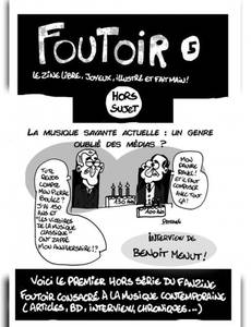 Voici le premier hors-série du fanzine Foutoir ! Aujourd'hui, c'est un numéro spécial "Musique contemporaine" ! Un peu comme un petit guide autour de la musique d'aujourd'hui. Anniversaires de Ravel et Pierre Boulez, une interview de Benoit Menut, des chroniques, des BD et des articles pour fêter cette musique rare ! Une trentaine de pages pour découvrir cet univers et même si nous ne connaissons par cette scène musicale. D'autres Hors-séries apparaitront sur ce sujet par la suite ! Bonne lecture et bonne écoute à tous !