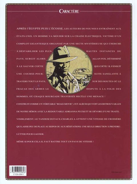 Après l'Egypte puis l'Ecosse, les auteurs de Fox nous entraînent aux Etats-Unis. Un homme va mourir sur la chaise électrique, victime de la couleur de sa peau. Alors surgissent quelques hommes déterminés à le sauver coûte que coûte. Parmi eux : Allan Fox. Il s'ensuit une course poursuite sanglante, et surtout les retrouvailles de notre héros avec la belle mais implacable Adriana Puckett. Construit comme un véritable ""road movie"", cet album se dévore d'une seule traite.
