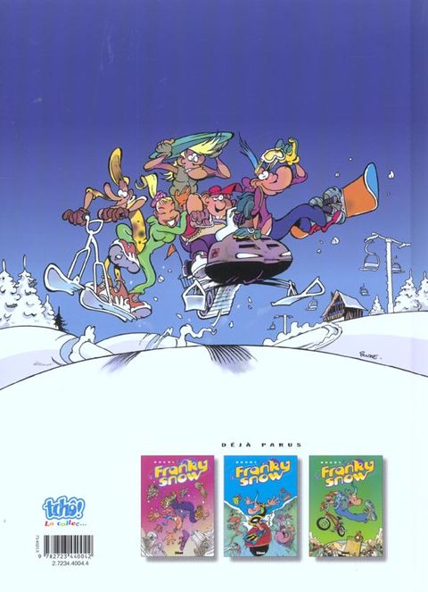 Est-il encore utile de vous présenter le désormais célèbre Franky Snow, le roi des sports extrêmes ? Rien ne lui fait peur, il est prêt à tout tenter, à prendre tous les risques, pour la panache, la plaisir, et surtout pour la frime. Longues pistes noires s'étendant à perte de vue... Rouleaux déchaînés faisant flipper les plus grands surfeurs des côtes... Pistes de skate à 90º... Avec les filles, il enchaîne aussi les prises de risques, mais ses gamelles sont encore plus violentes que lorsqu'il est sur son surf. Eté comme hiver, à la mer, à la montagne ou en ville, Franky expérimente : skate, rollers, ski, snowboard, mountainboard, saut à l'élastique, VTT, alpinisme, escalade, ... Amateurs de sensations fortes, venez surfer sur la vague Franky Snow !