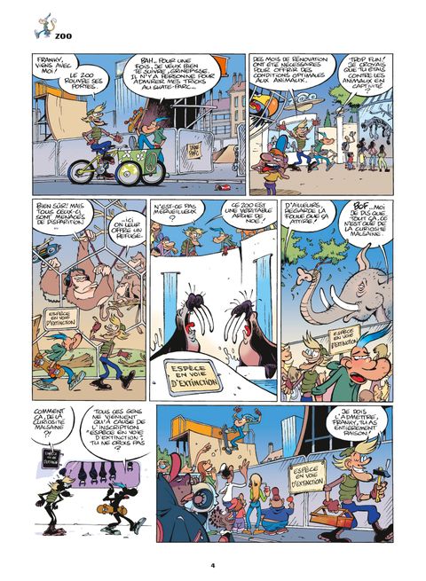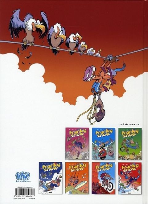 Mèche bleue, pistes noires et calbars à coeurs roses : c'est Franky Snow ! Franky, c'est le king de la glisse : roller, skate, surf, sur neige, sur bitume, rien ne lui résiste ! Enfin rien... à part les filles, qui malgré ses baggys de la mort, ses calbars qui tuent et ses half pipe de killer, ne voient en lui qu'un gros naze lourdingue monté sur skis ou roulettes selon la saison. Et pourtant Franky fait tout pour leur plaire ! Sauf qu'il ne suffit pas d'être le roi du tire-fesses et de pincer celles des jolies skieuses qui vous passent à portée de surf pour trouver l'âme soeur... Heureusement que Franky a ses potes, avec lesquels il arpentera la jungle urbaine jusqu'à réaliser le back twist ultime, et qui sait : enfin décrocher un sponsor pour faire de la compète ! Allez zou : un Franky Snow sous chaque pied en guise de snow blade et vous voilà prêt pour un slide de ouf sur les pistes noooooooooooooooooooooires !