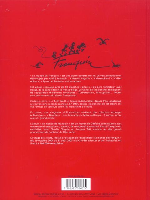 " le monde de franquin " est une porte ouverte sur les univers exceptionnels développés par andré franquin : " gaston lagaffe ", " marsupilami ", " idées noires ", " spirou et fantasio " et les autres. cet album regroupe près de 50 planches "phares " du père fondateur, avec hergé, de la bande dessinée franco-belge. certaines de ces planches témoignent de l'apparition d'éléments mythiques : turbotraction, marsupilami. toutes sont des sommets du dessin franquinien. certains récits (" le petit noël "), bijoux indisponibles depuis trop longtemps, retrouvent une seconde jeunesse. en effet, toutes les planches de cet album ont été remises en couleurs selon les indications d'origine. en outre, une vingtaine d'illustrations révèlent des créations étranges (" monstres ", " doodles". ) ou hilarantes (" mitre railleuse". ) encore inconnues du grand public. l'album " le monde de franquin " est un moyen de (re)faire connaissance avec une oeuvre d'exception et, surtout, de comprendre pourquoi andré franquin est considéré, avec charlie chaplin ou jacques tati, comme un des grands pourvoyeurs de bonheur du xxe siècle. le tirage de ce livre, réalisé à l'occasion de l'exposition " le monde de franquin " (du 19 octobre 2004 au 31 août 2005 à la cité des sciences et de l'industrie), est limité à 100. 000 exemplaires.