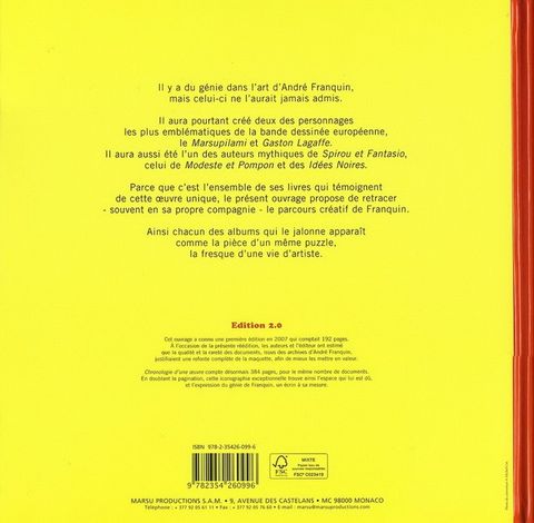 Le contenu de l'ouvrage a été multiplié par 2 entre 2007 et 2012. Pour cette raison, l'édition de 2012 est considérée comme une nouvelle publication (et pas une nouvelle édition) Enfin ! La réédition de l’ouvrage de référence sur l’œuvre de Franquin ! Longtemps épuisé, Chronologie d’une œuvre est réédité dans une version améliorée. Deux fois plus de pages ! Des illustrations deux fois plus grandes ! André Franquin est un des grands artistes européens du vingtième siècle. Sans lui, la bande dessinée, art majeur en Belgique francophone, n’aurait pas connu un tel développement créatif. Un des secrets du créateur de Gaston Lagaffe, du Marsupilami et des Idées noires, fut de toujours inscrire son travail dans la marche du monde, tout en apportant du bonheur et de l’intelligence à ses lecteurs. Avec Hergé, il est à l’origine d’un pan majeur de la bande dessinée de la seconde moitié du vingtième siècle. Le père de Tintin fonda la « ligne claire », alors que Franquin créa, presque à lui tout seul, une nouvelle forme d’humour dessiné. Si Hergé a concentré son énergie sur Tintin, Franquin a, lui, bâti un univers formé de multiples planètes, qui parfois s’entrechoquent. Même s’il n’en est pas le véritable père, c’est à Franquin que l’on pense d’abord quand on parle de Spirou et Fantasio. C’est lui qui a véritablement donné ses lettres de noblesse à la série, avant de créer ses deux personnages favoris : le mythique Gaston Lagaffe et la bondissante bestiole tachetée : le Marsupilami. Ceci suffirait à remplir la vie de n’importe quel auteur, mais pas celle de Franquin qui, non content d’animer l’hebdomadaire Spirou a également créé : Modeste et Pompon (annonciateurs de l’esprit « Atomium 58 ») ou Le Petit Noël (un hymne à l’enfance), sans oublier les affreusement hilarantes Idées Noires et les poétiques Tifous. Même s’il aurait préféré ne plus jamais dessiner plutôt que de l’admettre, il y a du génie dans l’art d’André Franquin. Ce génie tient autant à son exceptionnel talent de dessinateur et de conteur qu’à la perfection de son œuvre intemporelle et aux valeurs humaines qu’elle continue à incarner. C’est derrière les multiples facettes de cette œuvre magistrale qu’il faut rechercher Franquin, l’homme. Lui qui derrière toutes ses créations poursuivait un seul et unique but. Le plus difficile, le plus beau, le plus terrible : faire rire! Dans la nouvelle mise en page de cet ouvrage depuis longtemps épuisé, la taille de tous les visuels a été doublée pour mieux restituer tout le génie du trait de Franquin. Revivez au fil des albums, l’extraordinaire parcours créatif d’un génie de la BD. Parce qu’après tout, ce sont les livres qui témoignent de cette œuvre unique, Chronologie d’une œuvre retrace la carrière d’André, au fil du temps. Chaque album est la pièce d’un puzzle : la fresque de la vie de Franquin. Au cours de ce voyage passionnant, vous serez guidé par ses commentaires pleins de justesse, d’humour, d’humanité et de modestie.