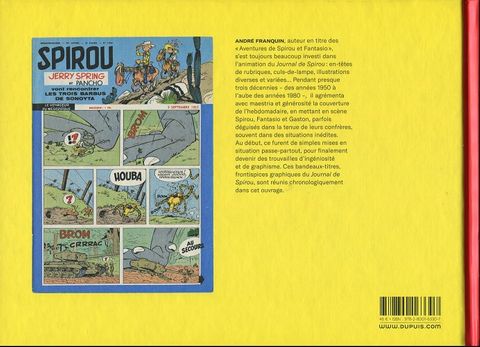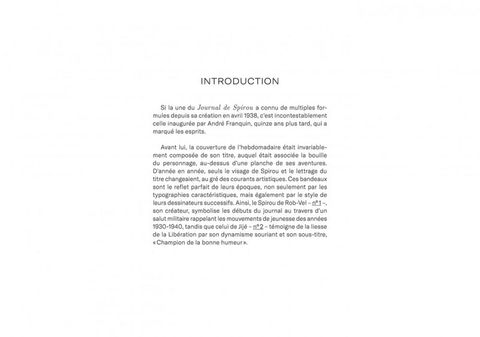 La couverture du Journal Spirou a souvent fait l'objet d'animations évoluant au gré du temps. C'est ainsi qu'à partir de 1953 - et jusqu'en 1964 -, Franquin a réalisé chaque semaine une illustration pour mettre en avant l'une ou l'autre série. Il fallait tout son talent pour dynamiser (et dynamiter !) les codes habituels et faire de ces images de véritables petits tableaux, d'une créativité et d'une générosité à l'image de leur auteur. Ainsi, à la manière d'un Monsieur Loyal, Spirou (mais aussi Fantasio et Gaston Lagaffe) présente avec une fantaisie débridée le sommaire de la semaine et endosse avec humour le costume des héros du Journal Spirou. Aujourd'hui, ces illustrations apparaissent comme un fantastique témoignage de ce que fut l'âge d'or du Journal de Spirou, alors dirigé par Yvan Delporte, et les commentaires associés racontent en filigrane le lien infini entre Franquin et l'hebdomadaire. Ces bandeaux-titres sont présentés pour la première fois dans leur intégralité ? en plusieurs volume dont voici le premier. Alors qu'ils étaient publiés originellement dans des conditions techniques difficiles, ils ont fait ici l'objet d'une restauration minutieuse, propre à mettre en valeur le travail de Franquin.