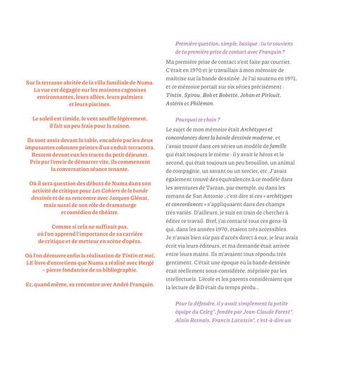 Entretien avec un témoin du siècle Né avec l’avènement de la bande dessinée franco-belge, Numa Sadoul en a été un lecteur passionné avant même qu’elle entre dans son âge d’or ! Acteur et observateur majeur de l’explosion culturelle de la bande dessinée dans les années 1970, il en est aujourd'hui un témoin de premier plan. La position de critique et d’essayiste de l'auteur de Tintin et moi, entretiens avec Hergé, le place d’emblée en marge de l’histoire, tout autant que ses amitiés sincères avec Gotlib, Moebius, Forest et tant d'autres, sur lesquelles il revient généreusement à travers Franquin et moi. En lui donnant la parole, Christelle Pissavy-Yvernault entre d’un pas décidé dans les coulisses de la bande dessinée en même temps que dans le making of de Et Franquin créa la gaffe, LE livre de référence qu'il a réalisé avec Franquin. Cet ouvrage, enrichi par une importante iconographie, dans lequel Numa se livre est un précieux témoignage, passionné, sincère et érudit pour quiconque s’intéresse à Franquin, mais aussi à l'histoire de la bande dessinée.