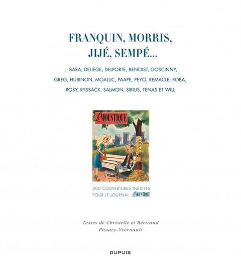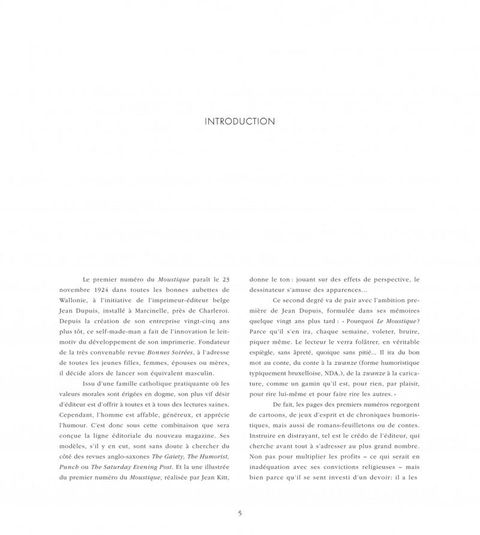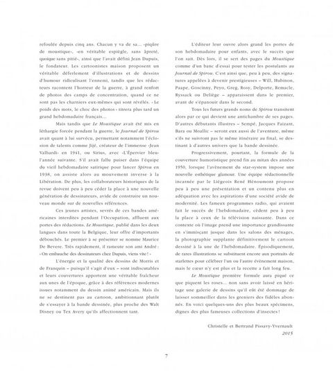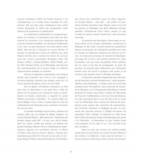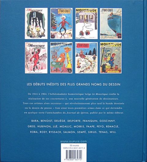 Un ouvrage d'art attendu de tous les passionnés du Journal de Spirou ! On connaît les magnifiques couvertures du Journal de Spirou réalisées par Franquin, Morris, Jijé, Will, Rosy ou Peyo. Cependant, ces mêmes artistes signaient d'autres splendides illustrations couleurs publiées alors en une de la revue belge Le Moustique. Alors qu'elles dormaient depuis des décennies dans les archives de collectionneurs, 200 de ces couvertures sont présentées dans cet ouvrage de 312 pages. S'ajoutent à cette prestigieuse liste les noms d'auteurs majeurs tels Sempé ou Goscinny... Ces illustrations sont accompagnées de commentaires racontant à leur façon l'histoire de ces auteurs qui ont fait Le journal de Spirou.