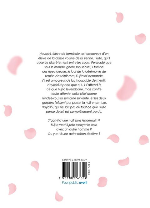 Hayashi, élève de terminale, est amoureux d'un élève de la classe voisine de la sienne, Fujita, qu'il observe discrètement entre les cours. Persuadé que tout le monde ignore son secret, il tombe des nues lorsque, le jour de la cérémonie de remise des diplômes, Fujita lui demande s'il est amoureux de lui. Incapable de mentir, Hayashi répond que oui. Il s'attend à ce que Fujita le rembarre, mais contre toute attente, celui-ci lui donne rendez-vous la semaine suivante, et les deux garçons finissent par passer la nuit ensemble. Hayashi, qui ne sait pas du tout ce que Fujita pense de lui, est complètement perdu. S'agit-il d'une nuit sans lendemain ? Fujita veut-il juste essayer le sexe avec un autre homme ? Ou il y a-t-il une autre raison derrière ?
