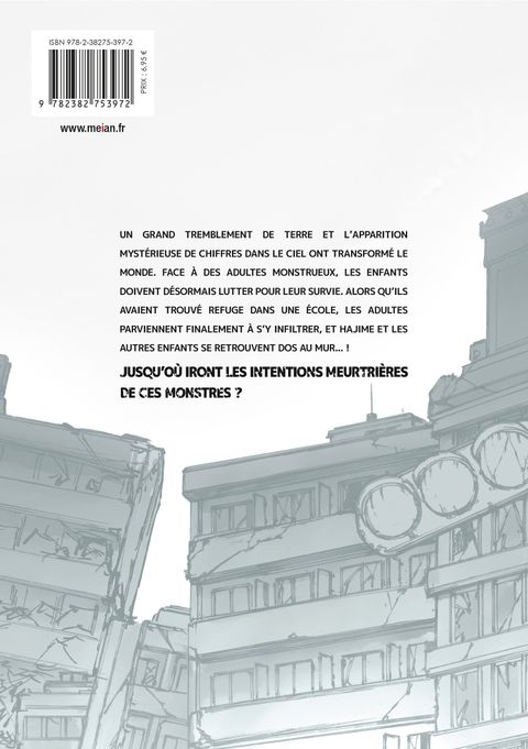 De courageux enfants font face à une violence sans limite !!Un grand tremblement de terre et l'apparition mystérieuse de chiffres dans le ciel ont transformé le monde. Face à des adultes monstrueux, les enfants doivent désormais lutter pour leur survie. Alors qu'ils avaient trouvé refuge dans une école, les adultes parviennent finalement à s'y infiltrer, et Hajime et les autres enfants se retrouvent dos au mur... !Jusqu'où ira les intentions meutrières de ces monstres ?
